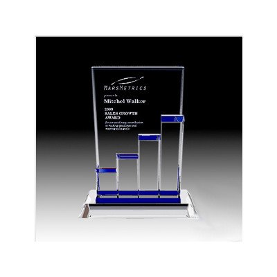 Eine Glastrophäe mit blauen Glasteilen und mit "Glasstufen" die den Erfolg symbolisieren. Veredelt werden können diese Glaspokale mit einer Lasergravur.